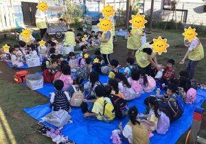 保育者はクラスごとに人数確認とその報告をし、子どもたちは避難の時のお約束『おかしもち』のお話を静かに聞くことができました。