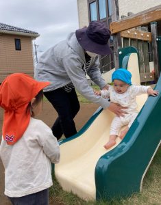 初めてのすべり台、優しく見守るのぞみ組のおねえさん( *´艸`)