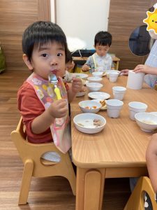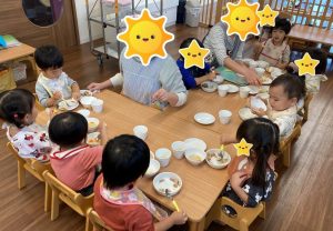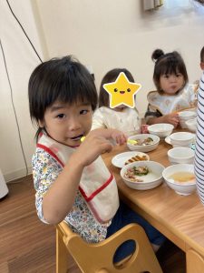 お外でいっぱい遊んだ後は、楽しい給食の時間(*^▽^*)/