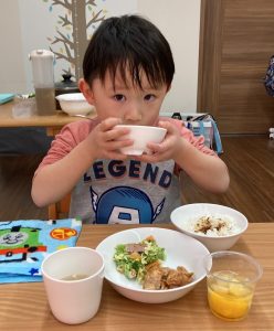 「いただきます」で最初に手をのばしたのが、お野菜たっぷりスープでした!